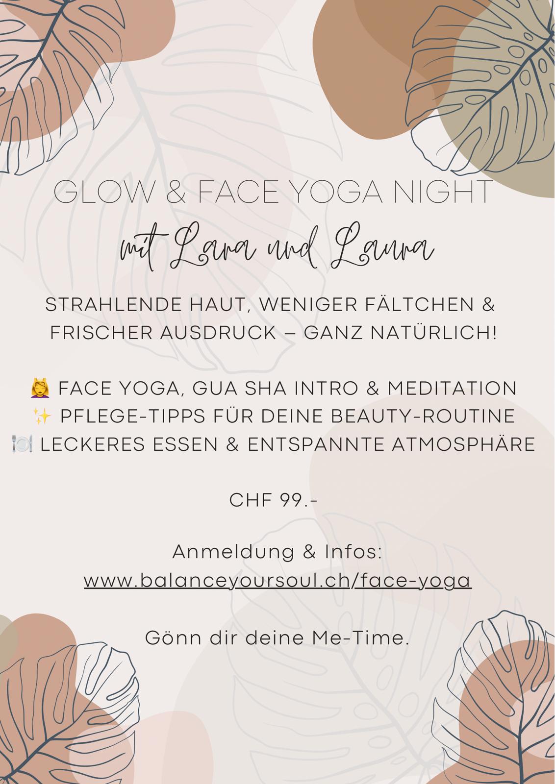 Bei unserer „Glow & Face Yoga Night“ lernst du dich und deine Gesichtshaut auf eine neue Art kennen. Mit gezielten Face Yoga Übungen, Gesichtsmassagen und Guashatechniken kannst du Fältchen vorbeugen, deine Haut straffen und ihr ein strahlendes, frisches Aussehen verleihen.